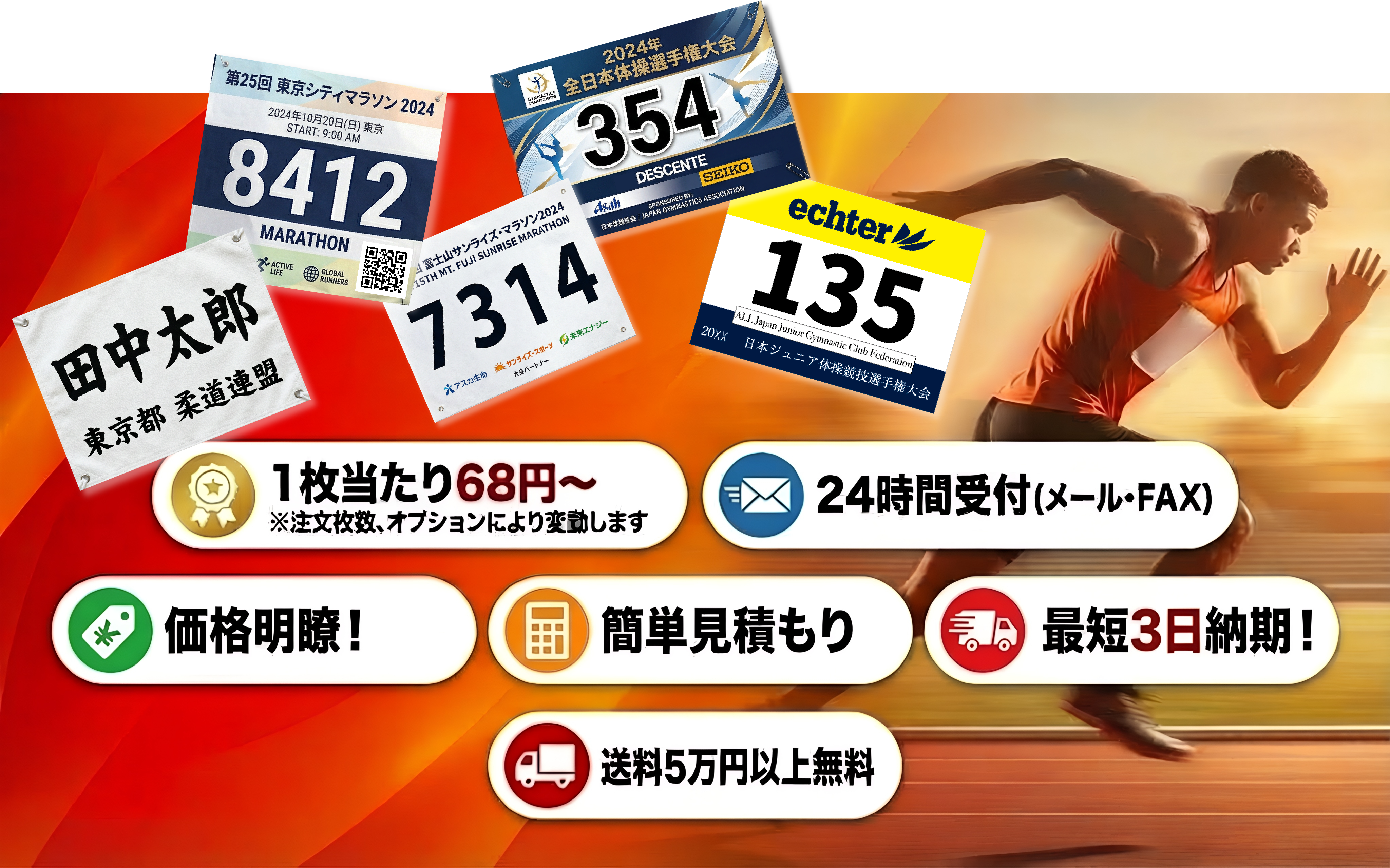 ご希望のサイズ・枚数・素材でお作りするオーダーメイドのゼッケンです。規格品にないサイズや少量ロットにも対応します。申込後、担当よりお見積もり・ご連絡をいたします。決済は銀行振り込みとなります。